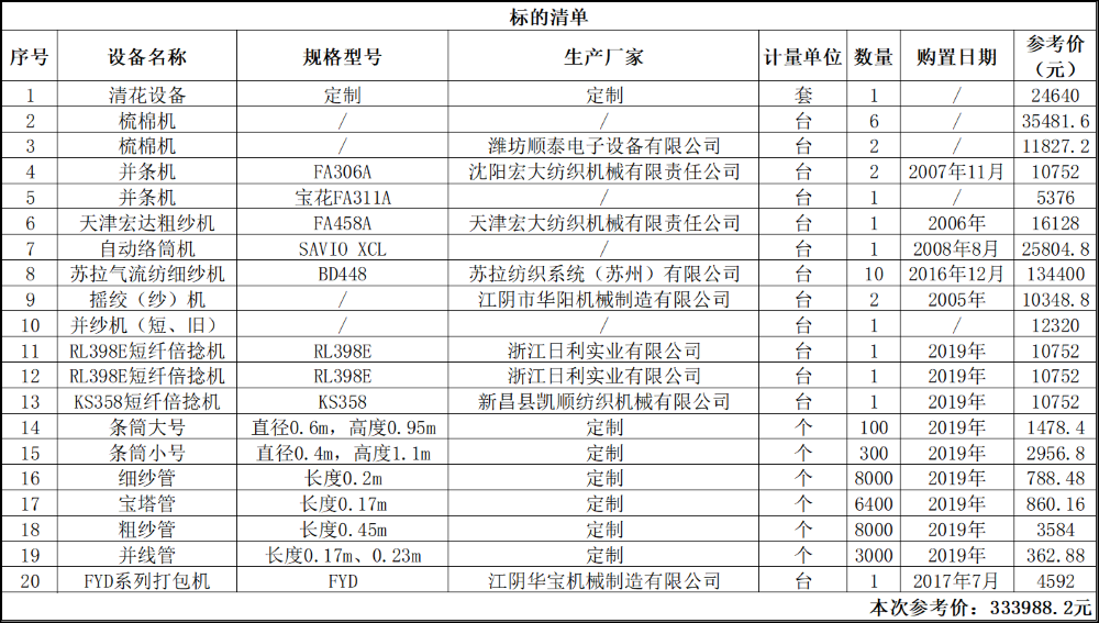 一、拍賣標(biāo)的:二手紡織設(shè)備一批,包括清花設(shè)備、自動(dòng)絡(luò)筒機(jī)、梳棉機(jī)、并條機(jī)、粗紗機(jī)、細(xì)紗機(jī)等。以上標(biāo)的整體拍賣,參考價(jià):333988.2元,F(xiàn)狀拍賣,現(xiàn)狀移交。競(jìng)買保證金:5萬元。