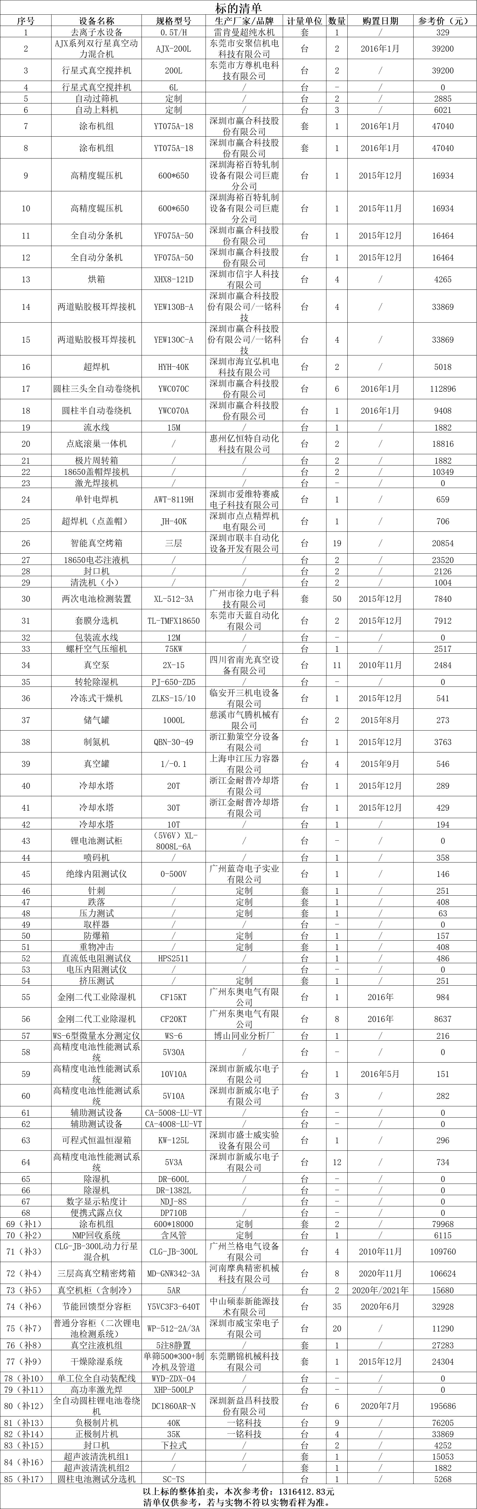 一、拍賣標的:全自動圓柱鋰電池卷繞機、正負制片機、AJX系列雙行星真空動力混合機、圓柱三頭全自動卷繞機、行星式真空攪拌機、涂布機組等二手設(shè)備一批,整體拍賣,參考價:1316412.83元。競買保證金:15萬元。