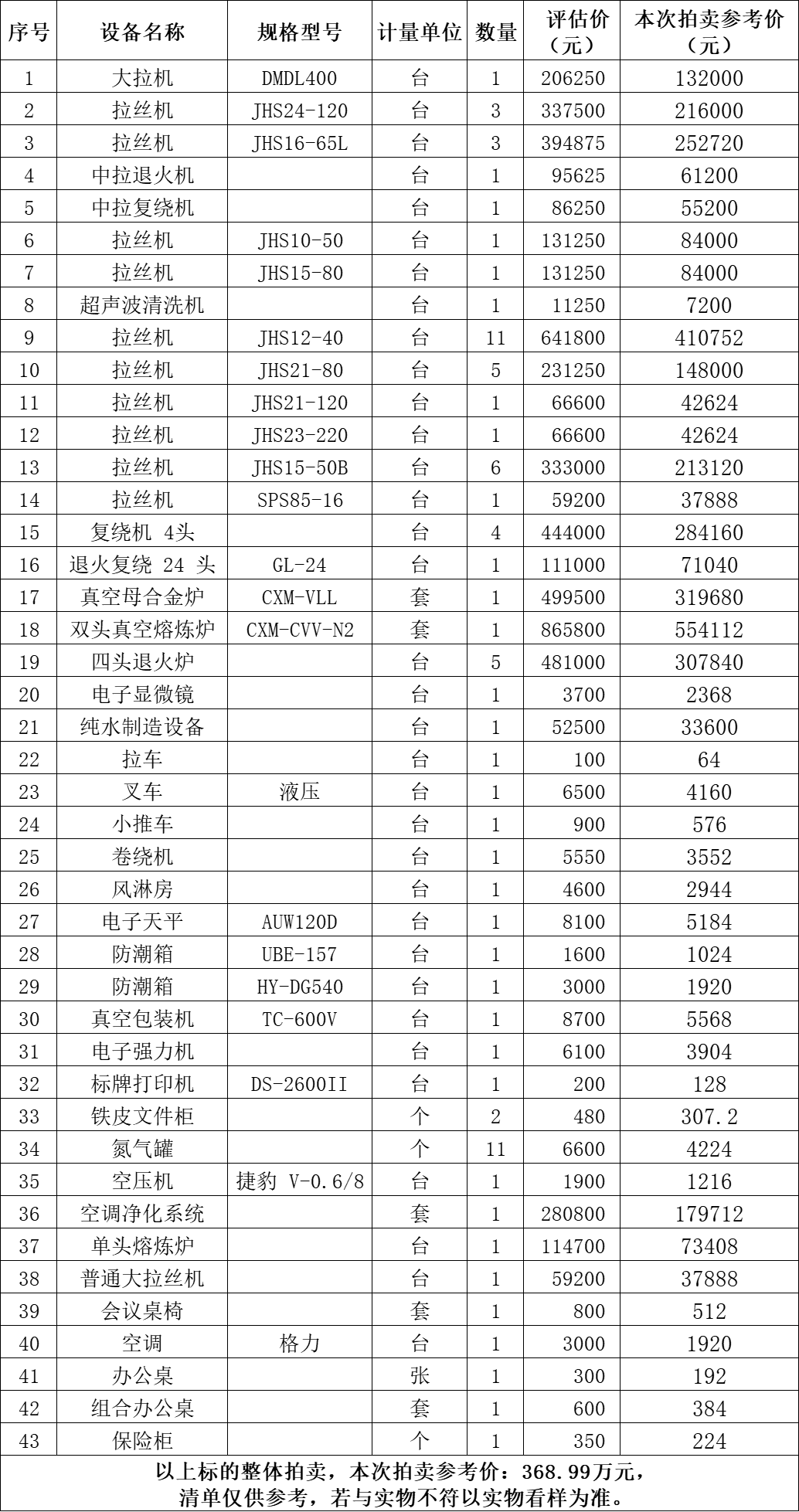 一、拍賣標(biāo)的:雙頭真空熔煉爐、真空母合金爐、空調(diào)凈化系統(tǒng)、拉絲機(jī)、復(fù)繞機(jī)4頭、大拉機(jī)、單頭熔煉爐等二手設(shè)備一批,整體拍賣,參考價(jià):368.99萬(wàn)元。競(jìng)買保證金:20萬(wàn)元。