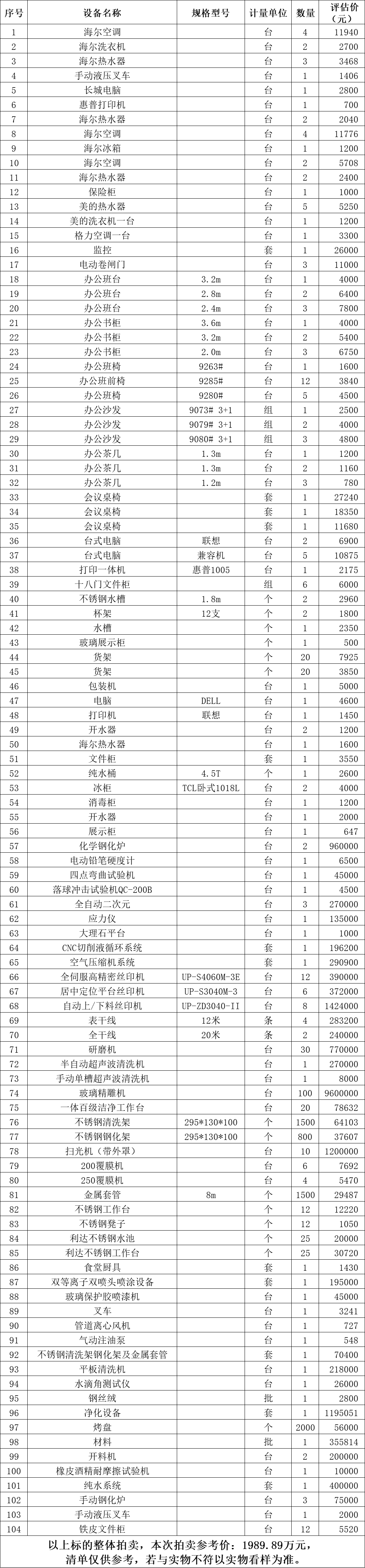 以現(xiàn)狀拍賣,現(xiàn)狀移交。標(biāo)的清單見下方表格。所附清單上標(biāo)的的數(shù)量及規(guī)格型號(hào)、廠家等信息僅供參考,若與實(shí)物不符以實(shí)物看樣為準(zhǔn),成交后以現(xiàn)場(chǎng)實(shí)物為準(zhǔn)移交。成交后,委托方提供增值稅專用發(fā)票。