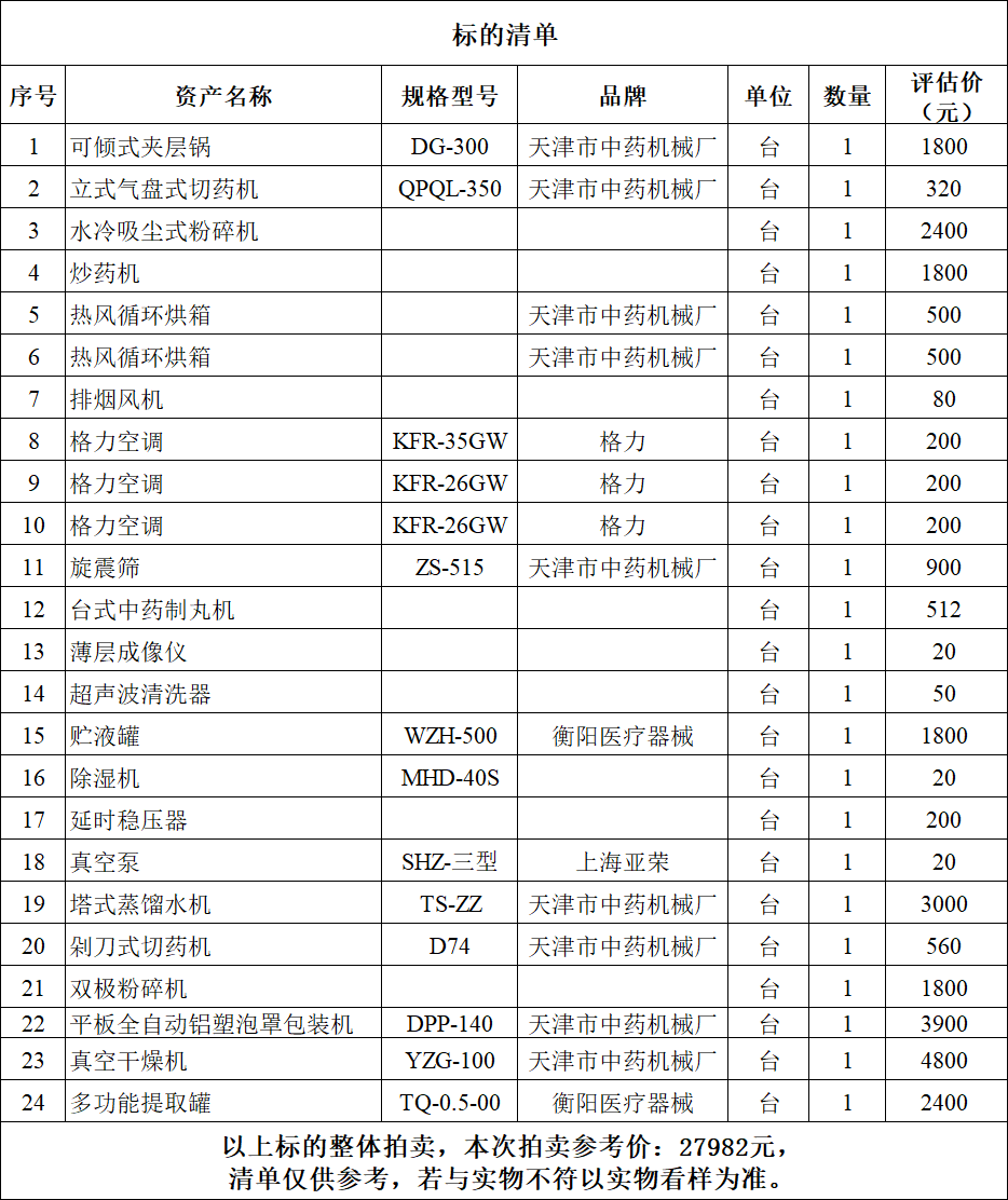 一、拍賣標的:六安市中醫(yī)院制劑室報廢設(shè)備一批,包括組合空調(diào)箱、真空干燥機、平板全自動鋁塑泡罩包裝機、風(fēng)冷模板等,參考價:27982元,競買保證金:5000元。