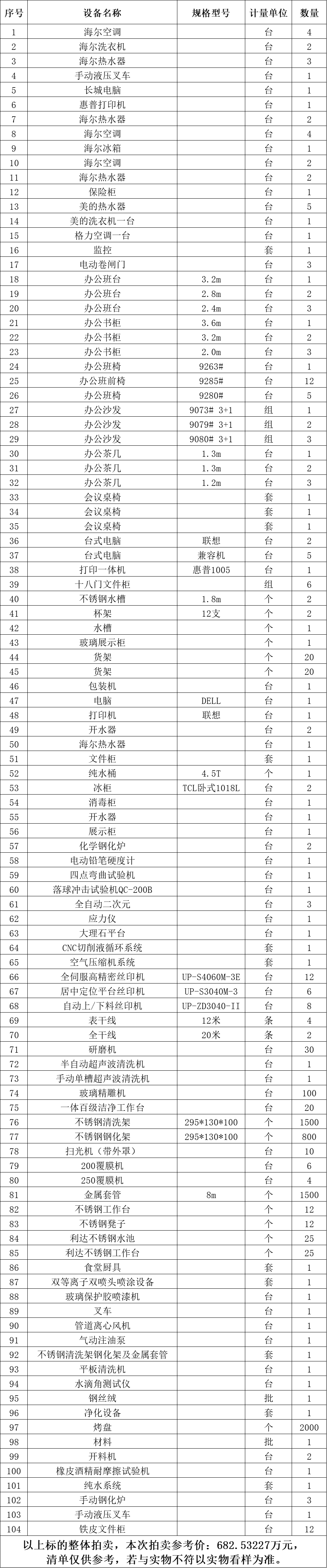 一、拍賣標(biāo)的:玻璃精雕機、自動上/下料絲印機、掃光機、凈化設(shè)備、研磨機、純水系統(tǒng)等二手設(shè)備一批,整體拍賣,參考價:682.53227萬元。競買保證金:70萬元。