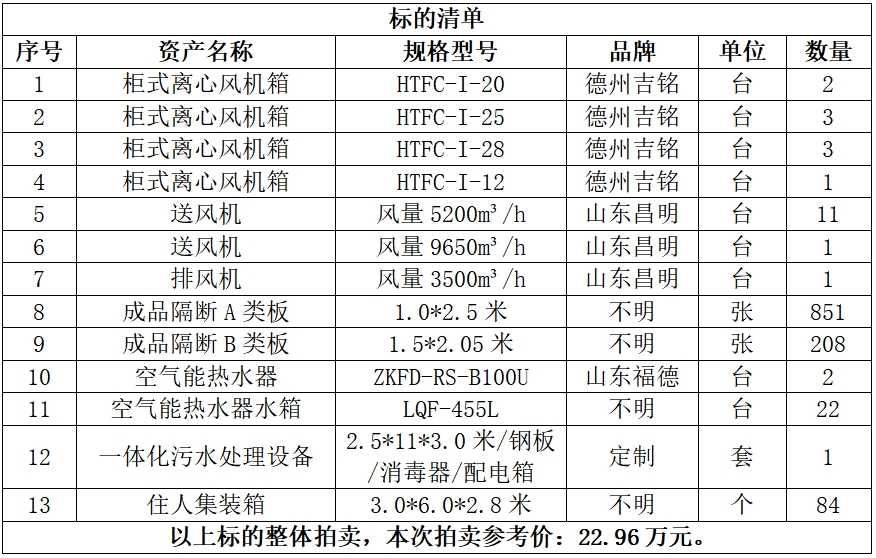 一、拍賣標(biāo)的:六安市中醫(yī)院閑置資產(chǎn)一批,包括:一體化污水處理設(shè)備、柜式離心風(fēng)機箱、空氣能熱水器、送風(fēng)機等,參考價:22.96萬元,競買保證金:5萬元。
