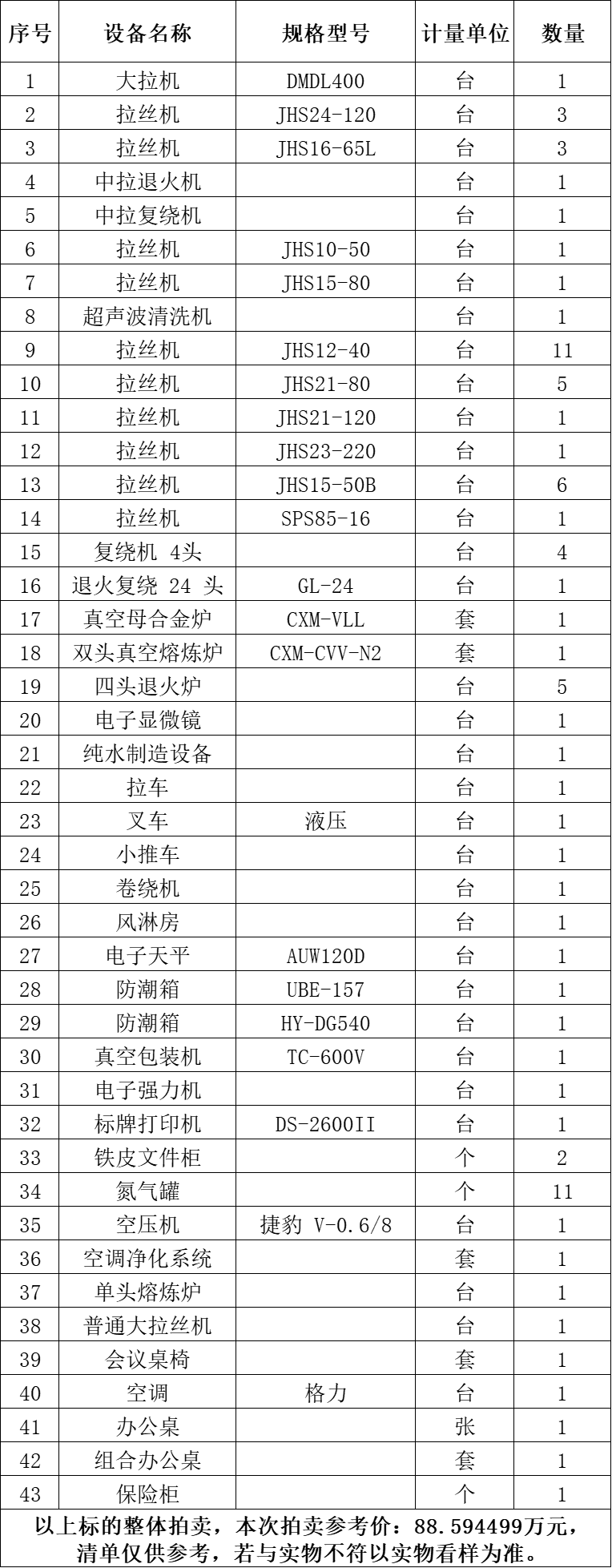 一、拍賣標(biāo)的:雙頭真空熔煉爐、真空母合金爐、空調(diào)凈化系統(tǒng)、拉絲機、復(fù)繞機4頭、大拉機、單頭熔煉爐等二手設(shè)備一批,整體拍賣,參考價:88.594499萬元。競買保證金:10萬元。
