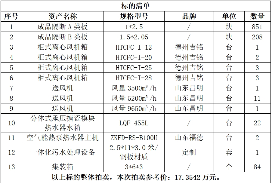 一、拍賣標(biāo)的:六安市中醫(yī)院設(shè)施設(shè)備一批,包括:集裝箱、一體化污水處理設(shè)備、柜式離心風(fēng)機(jī)箱、送風(fēng)機(jī)等,參考價(jià):17.3542萬元,競買保證金:2萬元。