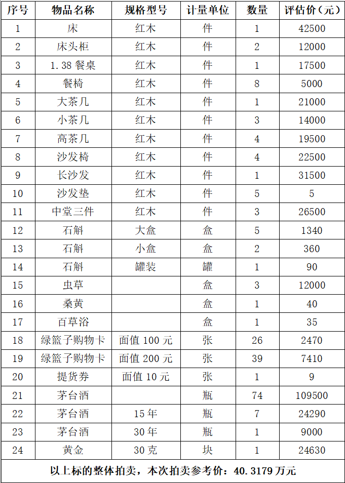 一、拍賣標(biāo)的:茅臺(tái)酒、黃金、家具等物品一批,整體打包拍賣,參考價(jià):40.3179萬元。競買保證金:8萬元。詳見下方明細(xì)表: