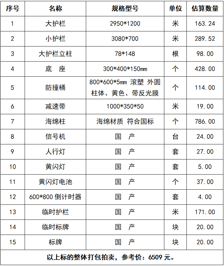 一、拍賣標(biāo)的:廢舊物資一批,包括護(hù)欄、防撞桶、黃閃燈電池等,參考價:6509元。