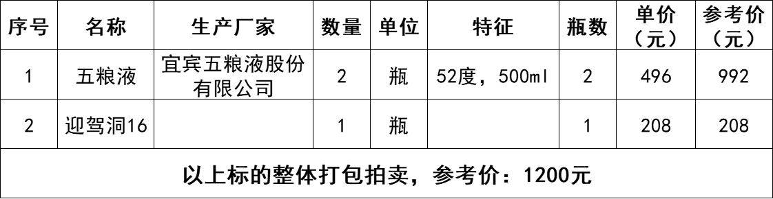 2、五糧液酒2瓶、迎駕洞藏16酒1瓶,整體打包拍賣(mài),參考價(jià):1200元,競(jìng)買(mǎi)保證金:1000元。標(biāo)的詳情見(jiàn)下方清單: