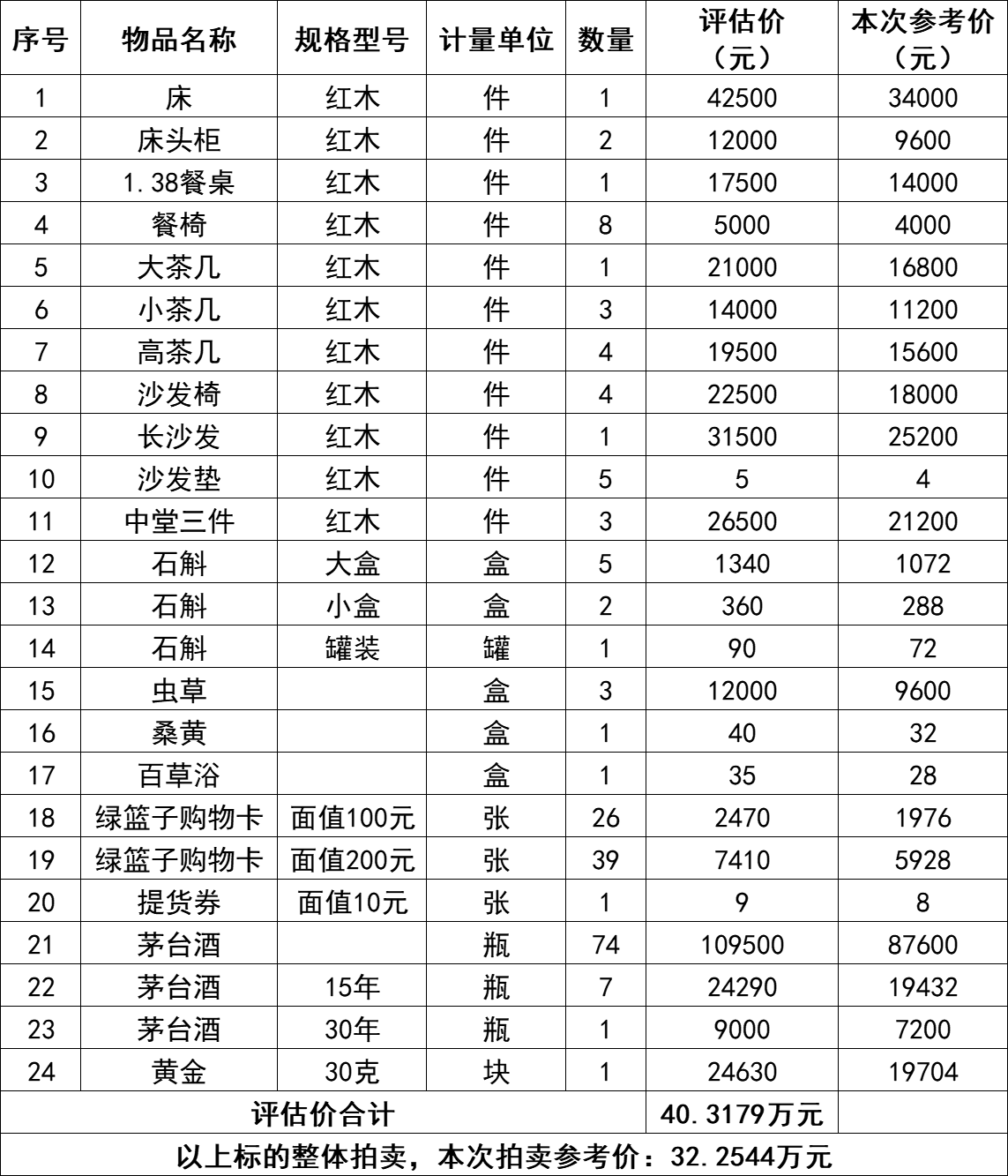 一、拍賣標(biāo)的:茅臺酒、黃金、紅木家具等物品一批,整體打包拍賣,參考價:32.2544萬元。競買保證金:6萬元。詳見下方明細(xì)表: