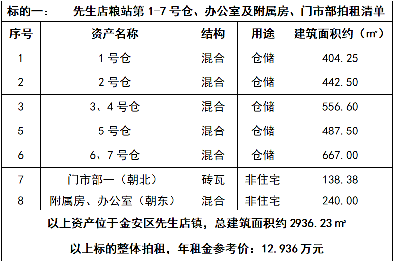 1、先生店糧站第1-7號倉、辦公室及附屬房、門市部3年期租賃經(jīng)營權(quán),整體拍租,總建筑面積約2936.23㎡,年租金參考價:12.936萬元,競租保證金:2萬元。標的詳情見下表: