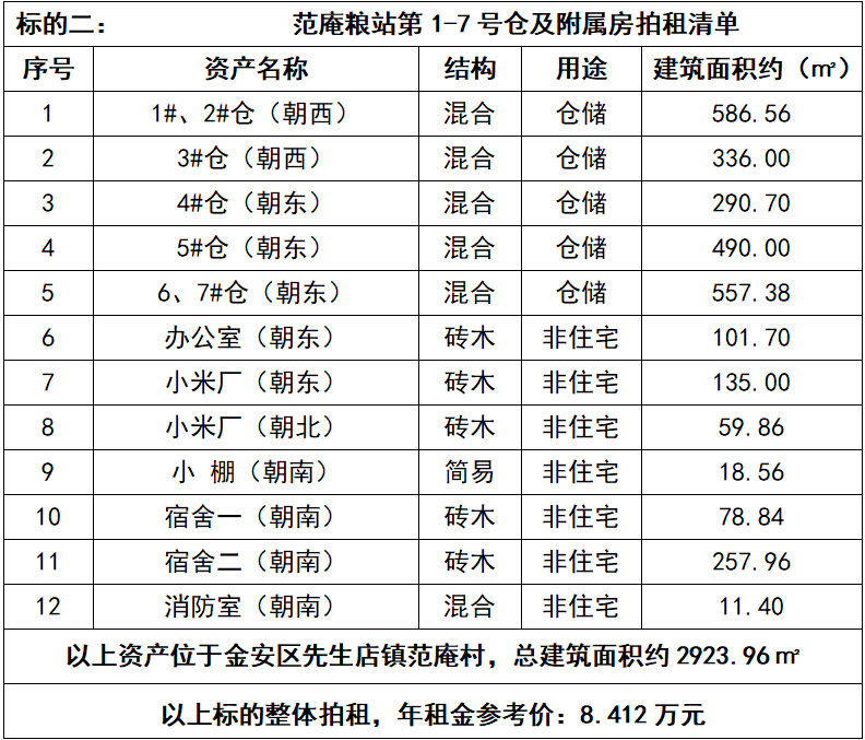 2、范庵糧站第1-7號倉及附屬房3年期租賃經(jīng)營權(quán),整體拍租,總建筑面積約2923.96㎡,年租金參考價:8.412萬元,競租保證金:1萬元。標的詳情見下表: