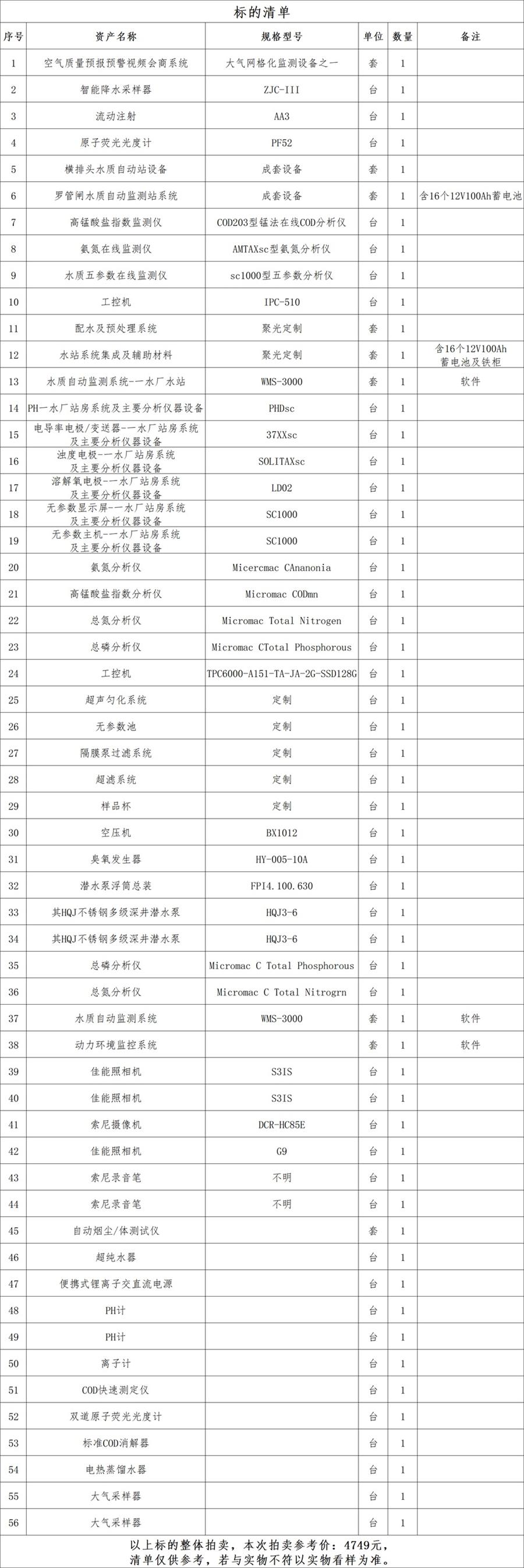 總磷分析儀、總氮分析儀、潛水泵浮筒總裝、空壓機、佳能相機等報廢檢測設備一批,打包拍賣。參考價:4749元,競買保證金:3000元。標的清單見下方表格(清單僅供參考,若與實物不符以實物看樣為準)。